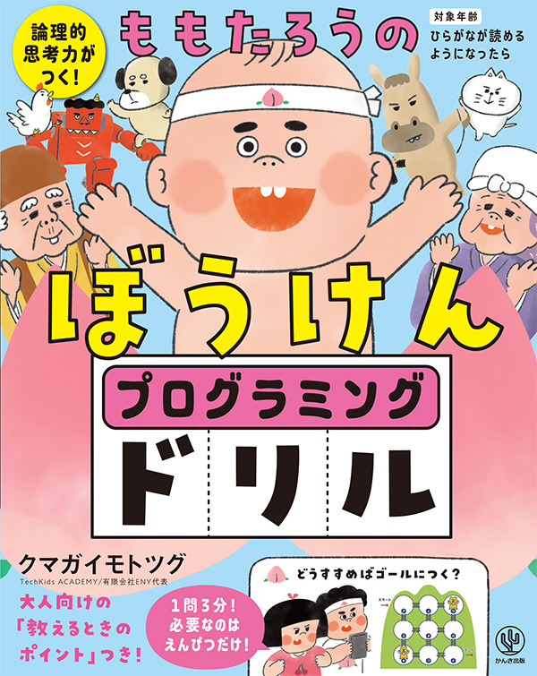 「ももたろうのぼうけんプログラミングドリル」著者、熊谷基継の本「小学校6年生までに必要なプログラミング的思考力が1冊でしっかり身につく本」では、scratchの基礎からゲームの作り方まで丁寧に解説しています。