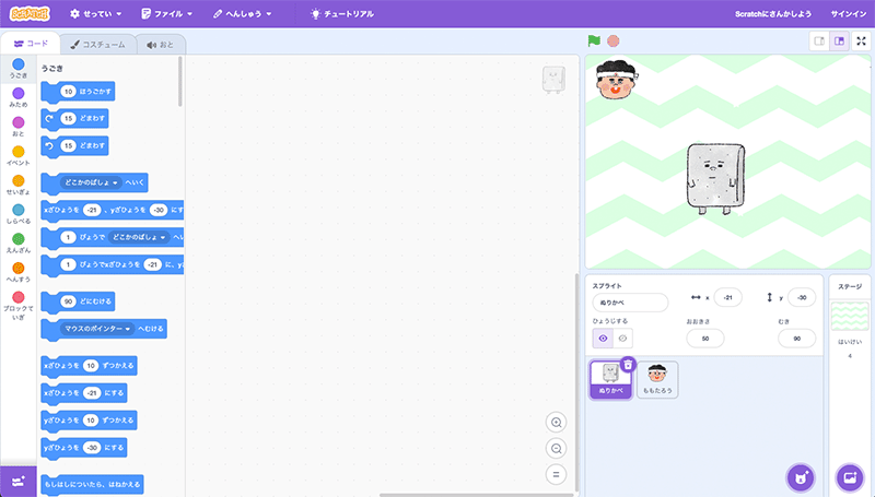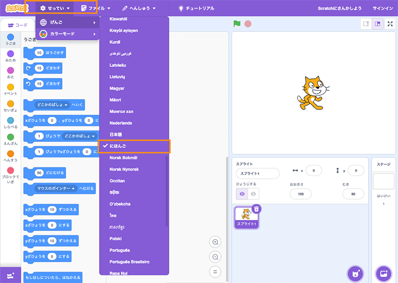 scratchのプログラムブロックやメニューを「ひらがな」表示にする場合は、上メニューの「設定」から、ひらがなの「にほんご」を選びます。 ※ドリルでは「ひらがな」モードになっています。