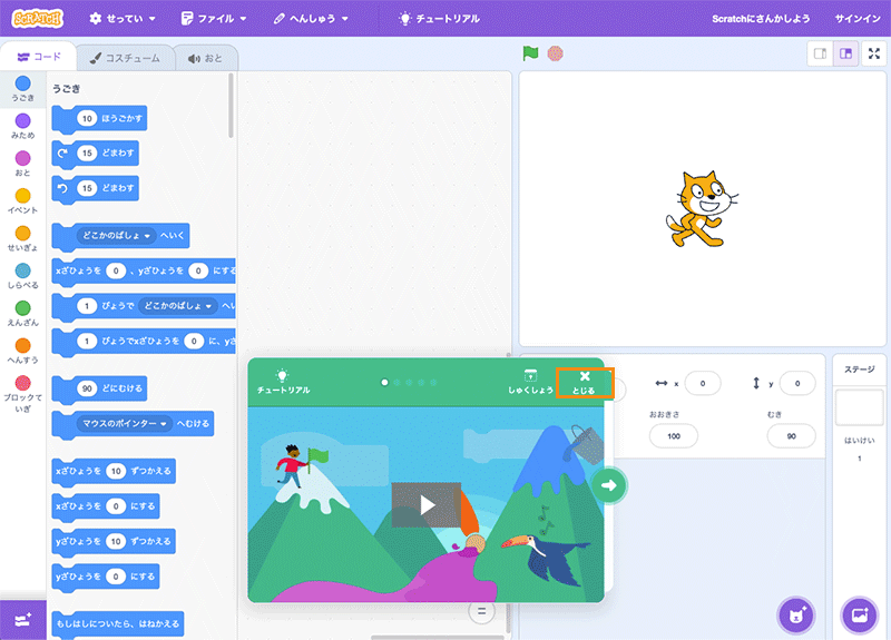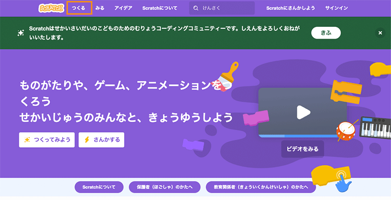 インターネットブラウザでプログラミングツール「scratch」にアクセスします。